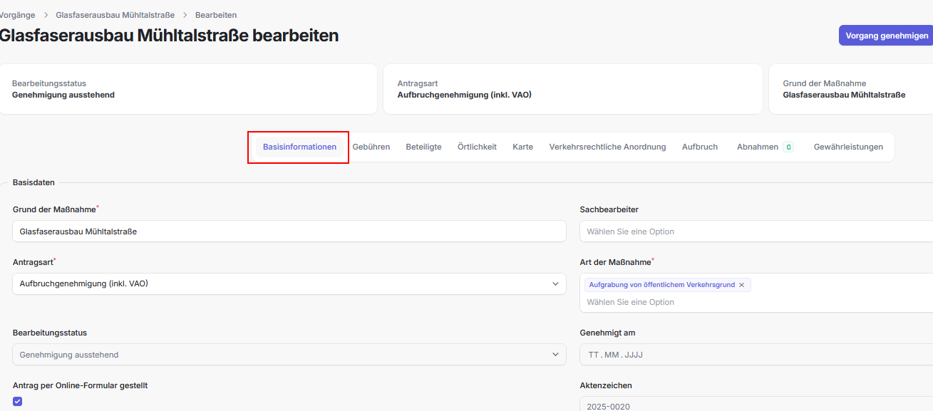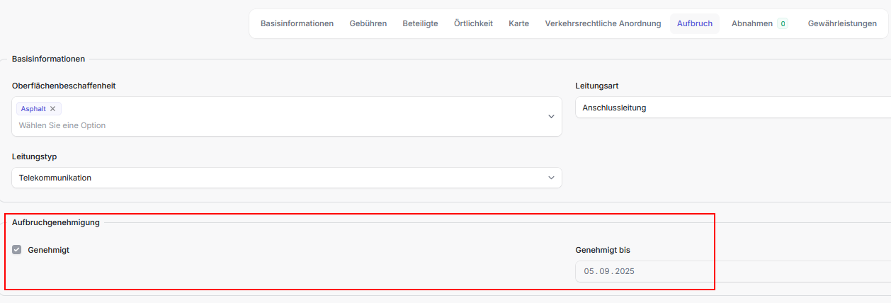 - Dieser Tab ist nur sichtbar wenn es sich bei der Antragsart um einen Aufbruch handelt, d.h. Aufbruchgenehmigung oder Aufbruchgenehmigung (inkl. VAO).