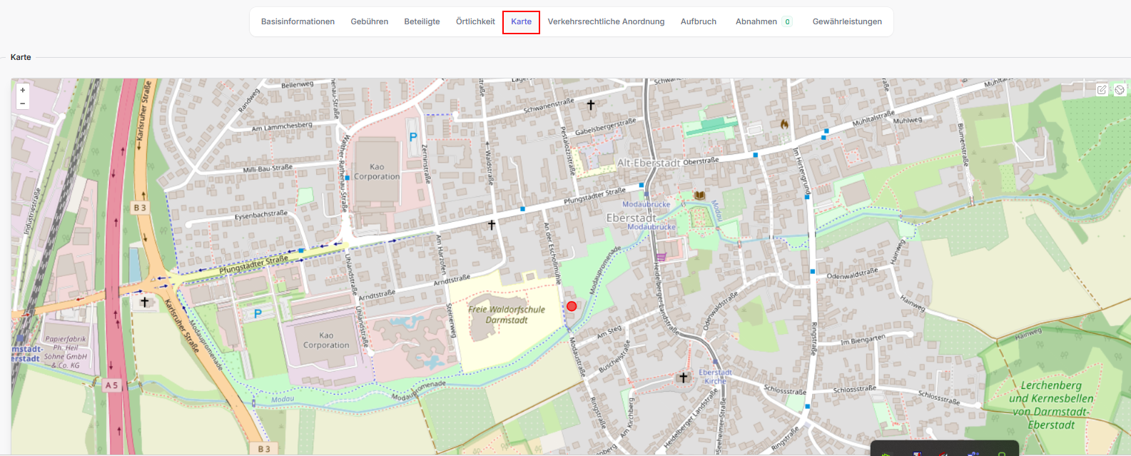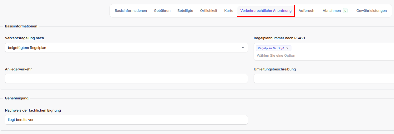 - Dieser Tab ist nur sichtbar wenn bei der Antragsart eine Verkehrsrechtliche Anordung Bestandteil ist, d.h. Verkehrsrechtliche Anordnung (VAO), Aufbruchgenehmigung (inkl. VAO) oder Sondernutzung (inkl. VAO)