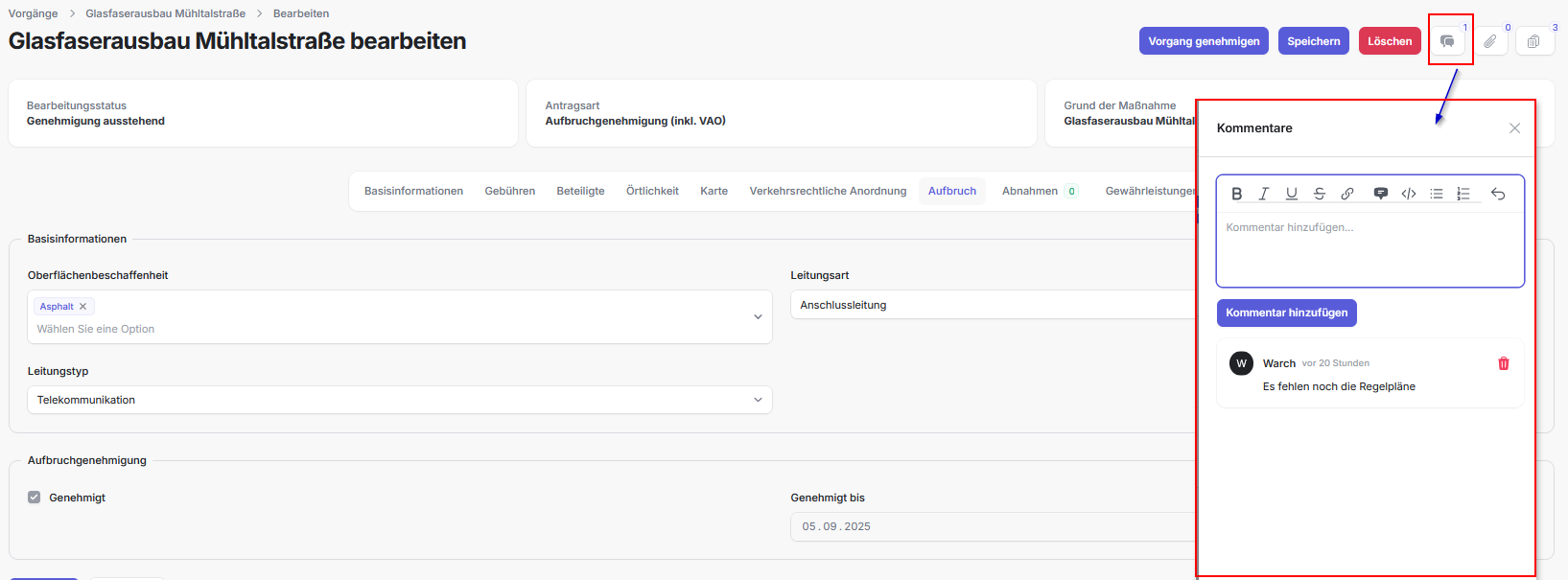 - Über die Kommentare kann zwischen AS und SB kommuniziert werden. Eine E-Mail-Erinnerung bei neuem Kommentar kann aktiviert werden.