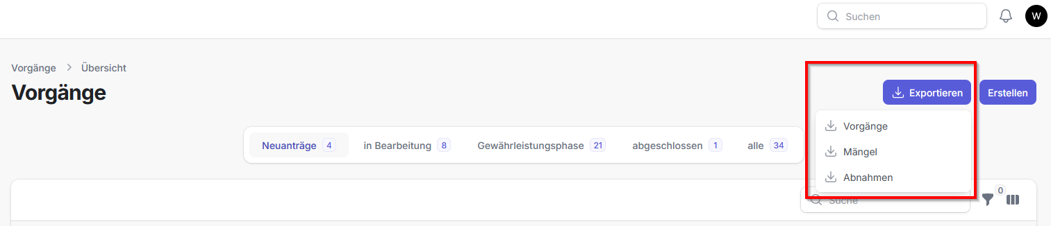 - Datensätze können auch nach xlsx oder csv exportiert werden, dabei können Vorgänge, Mängel oder Abnahmen gewählt werden.